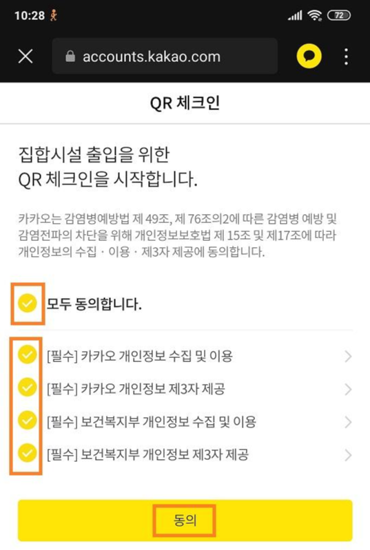 이후 개인정보 관련 동의 창에서 "모두 동의합니다" 체크박스를 를 체크하고 "동의"를 클릭합니다.