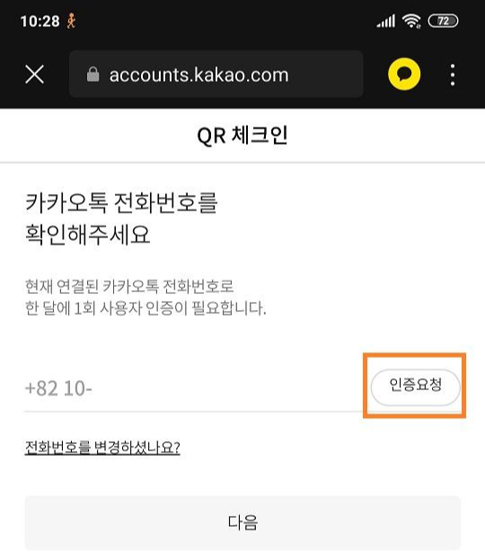 핸드폰번호 인증창이 뜨면 "인증요청"을 클릭합니다.