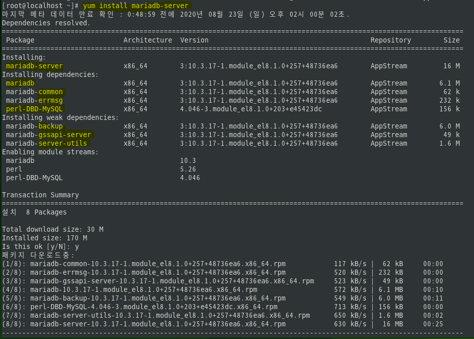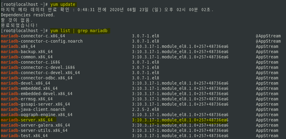 CentOS 8에서는 yum list에 기본적으로 mariadb-server가 존재합니다. (yum update 후에 조회해보세요)