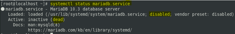 systemctl로 마리아DB의 상태를 확인합니다. 현재 상태는 dead 상태고, 재부팅시 자동시작도 disabled 상태입니다.