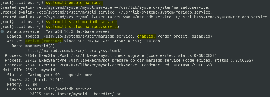 마리아DB를 재부팅시 자동시작되도록 enable 시켜주고, start도 시켜줍니다.