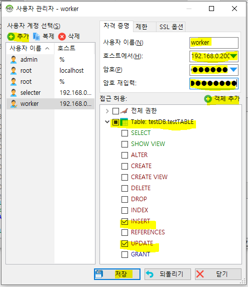 GRANT INSERT, UPDATE ON testDB.testTABLE TO selecter@'192.168.0.200'; -- 계정권한부여 INSERT UPDATE, testDB.testTABLE에만 접근, worker계정은 192.168.0.200에서만 접근가능