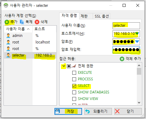 저장을 클릭하면 계정 목록에 selecter / 192.168.0.100 이 추가된 것을 확인 할 수 있습니다.
