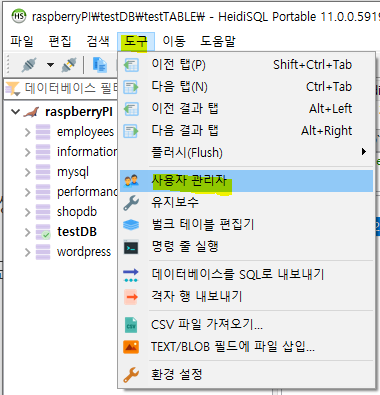 위에서 정의한 admin 계정을 생성하고 권한을 부여하는 GUI 방법을 설명드리겠습니다.먼저 메뉴 - 도구 - 사용자 관리자를 선택합니다.