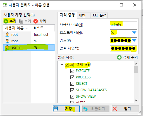 저장을 클릭하면 계정 목록에 admin % 가 추가된 것을 확인 할 수 있습니다.