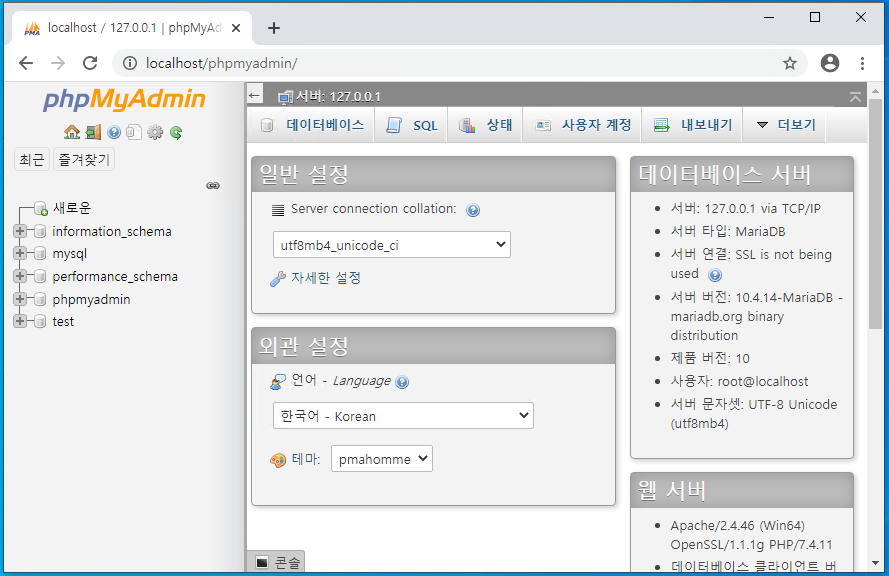 웹브라우저가 http://localhost/phpmyadmin/로 연결되서 아래 페이지가 뜬다면 설치가 완료된 것 입니다.