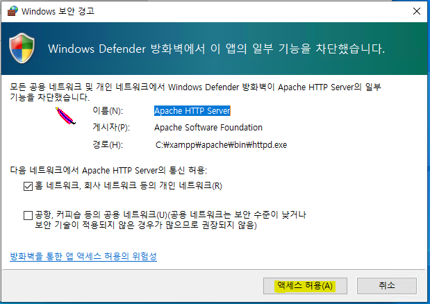 보안경고창이 뜨면 엑세스 허용을 클릭합니다. 아래 다른 경우에서 뜰 경우도 허용을 해야합니다.