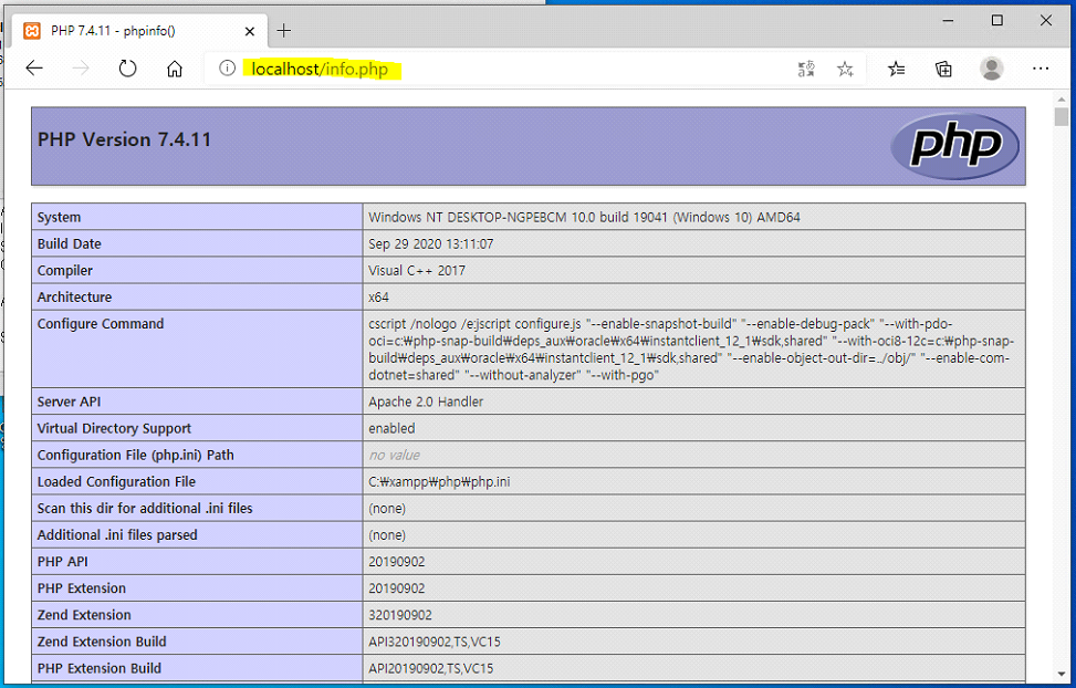이후 브라우저를 열고 localhost/info.php를 주소창에 입력했을 때 php 정보페이지가 뜨면 php가 정상 설치된 상태입니다.