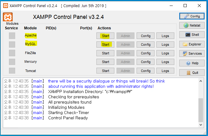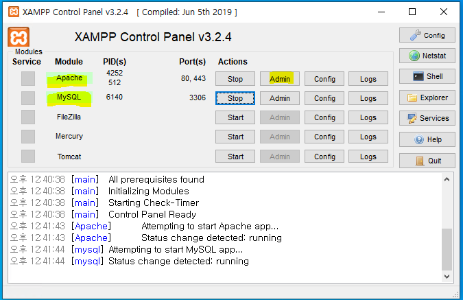 컨트롤 판넬이 시작되면 아파치와 DB를 스타트 합니다.