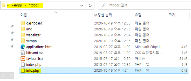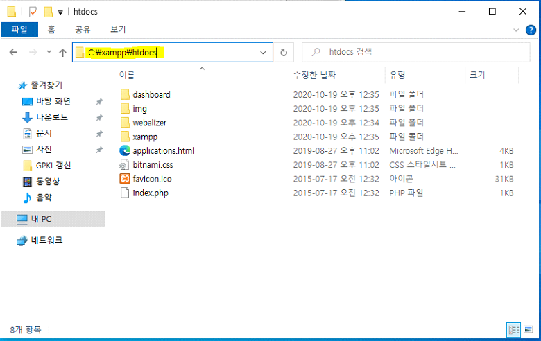 다음은 C:\xampp\htdocs 위치로 이동합니다. 이 위치가 브라우저 주소창에 localhost/ 를 입력했을 때의 폴더입니다.