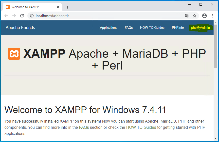 그러면 웹브라우저 창이 열리며 localhost/dashboard/로 연결을 합니다. 우측 상단에 phpMyAdmin을 클릭합니다.