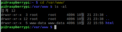 아파치(Apache)를 설치하시고 나면 /var/www/ 경로에 html이라는 폴더가 생성됩니다. 이 폴더가 브라우저로 라즈베리파이IP에 접근 시 자동으로 접속해주는 80포트로 설정된 기본 홈페이지 폴더입니다.