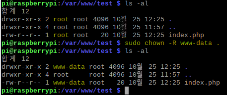 다음은 /var/www/test/ 폴더의 권한을 www-data로 변경해야 합니다. (명령어 마지막에 . 입력해야함)