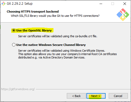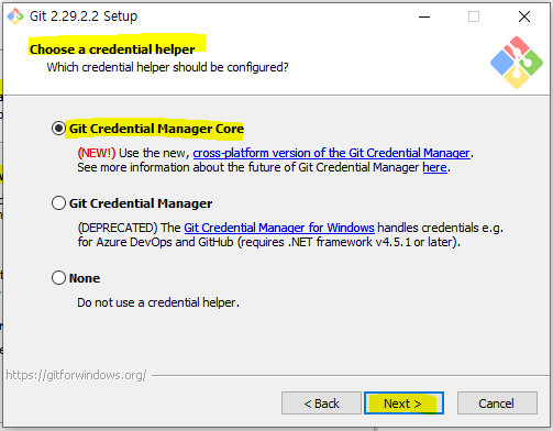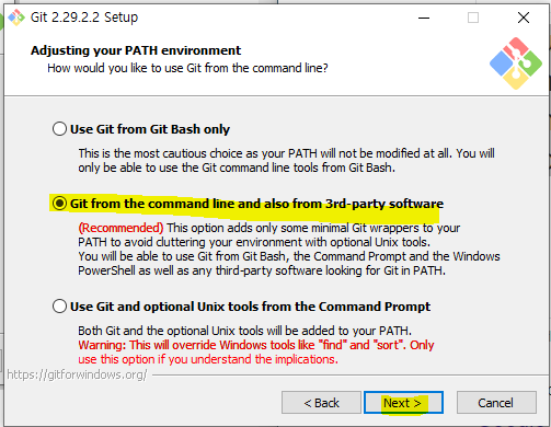 커맨드 라인에서 어떤 방법으로 깃을 사용 할지 선택하는 화면에서는 기본값 그대로 넥스트를 클릭합니다.