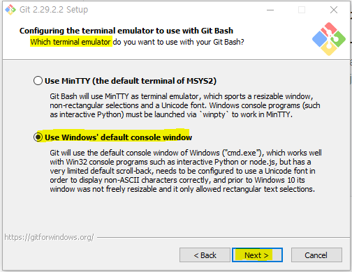 터미널 에뮬레이터 선택화면에서는 User Window's default console window를 선택합니다.