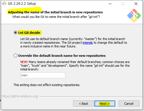 새 저장소에서 이니셜 브랜치의 이름은 깃이 설정하도록 선택하고 넥스트를 클릭합니다.