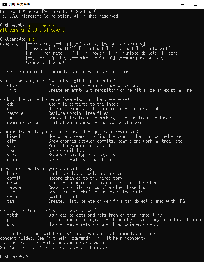 명령프롬프트(CMD)에서도 git --version 명령을 넣어 확인합니다.