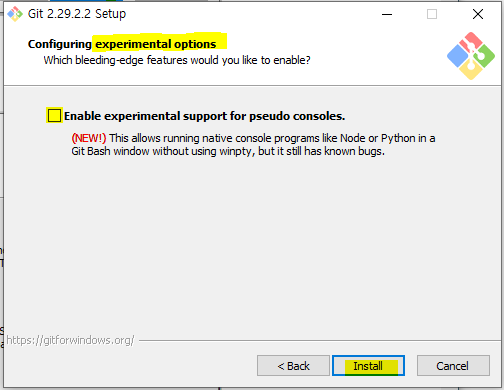 실험적 지원은 체크를 하지 않은 기본값 그대로 인스톨을 클릭합니다.