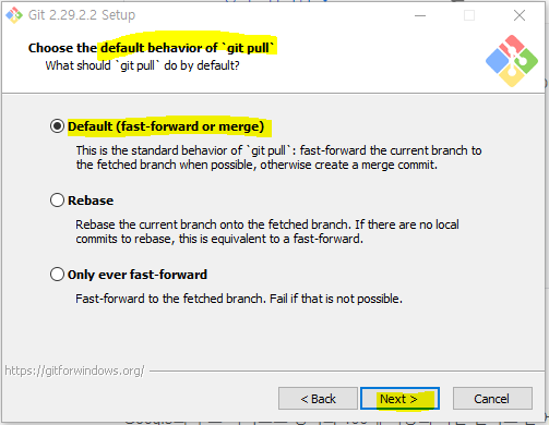 git pull 명령어의 기본 동작을 선택합니다. 기본값인 fast-forward or merge를 선택합니다.