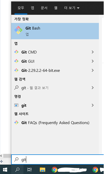 검색에서 git으로 검색해서 정상 설치 되어 있는지 확인을 합니다.