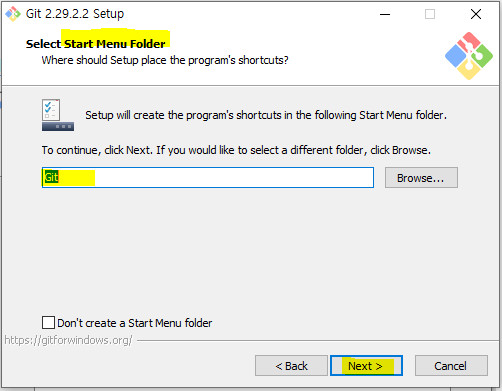 스타트 메뉴 폴더도 선택해 줍니다. 저는 기본값 그대로 Git으로 두고 넥스트를 클릭하겠습니다.