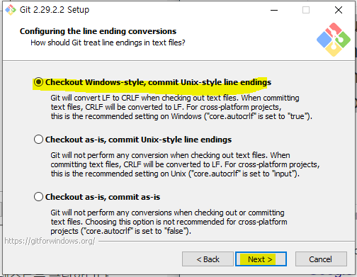 텍스트 파일에서 라인 끝부분을 어떻게 처리할 것인지 선택하는 화면도 기본값을 고르고 넥스트를 클릭합니다.