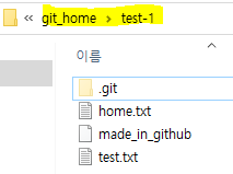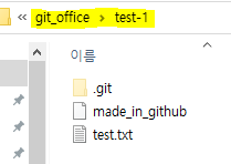 git_home과 git_office 폴더를 열어보면 폴더안에 test-1이라는 폴더가 생깁니다.