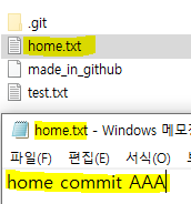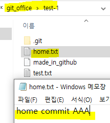 이제 git_home\test-1 폴더에서 home.txt 파일을 만들고 1열에 "home commit AAA"를 입력 저장하겠습니다.
