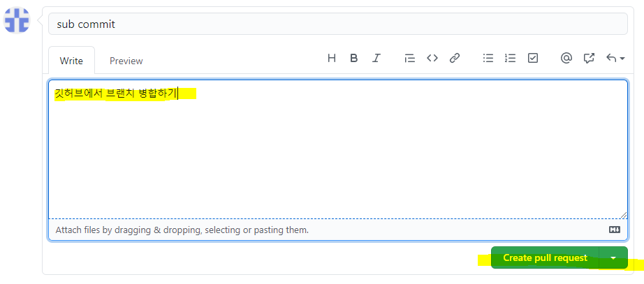 내PC(지역저장소) 브랜치를 깃허브(원격저장소)에 push 하고, 깃허브에서 병합(merge) 하기