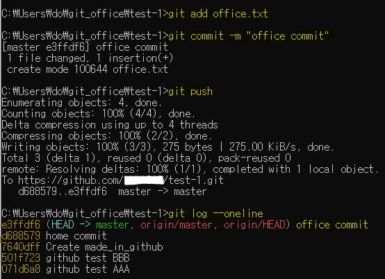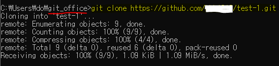 이제 git_office\test-1 폴더에서 내려받기를 통해 동기화를 해보겠습니다.