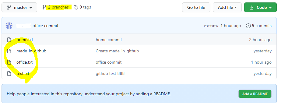 깃허브 홈페이지에서 새로고침을 해보면 브랜치가 2개로 확인됩니다.