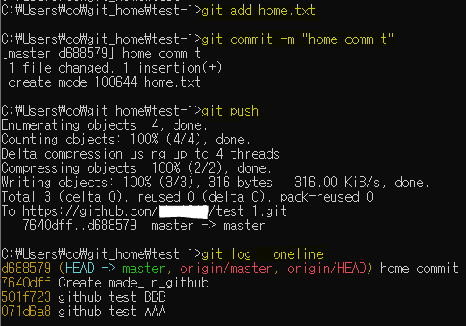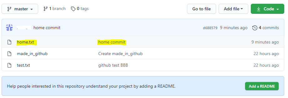 git add home.txt 명령으로 스테이징을 하고, git commit -m "home commit" 명령으로 커밋을 추가한 후 git push 명령으로 깃허브에 올리겠습니다.