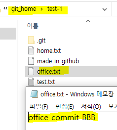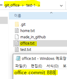 먼저 git_office\test-1 폴더에 office.txt 파일을 만들고 1열에 "office commit BBB"를 입력 및 저장합니다.
