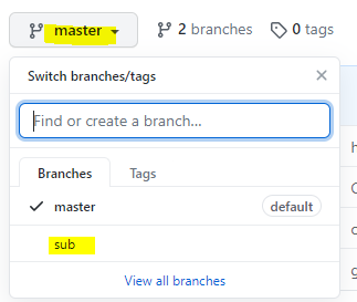 마스터 를 클릭하고 sub 브랜치로 스위치를 하면 sub.txt 파일이 나오는 것을 확인 할 수 있습니다.