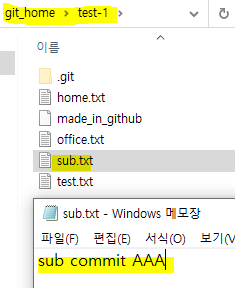 git_home\test-1 폴더에 sub.txt 파일을 생성하고 1열에 "sub commit AAA" 입력 및 저장합니다.