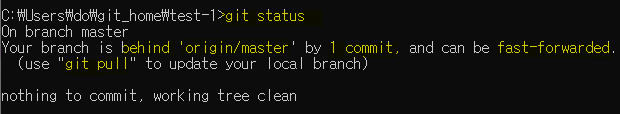 하지만 git status 명령어로 상태를 확인하면 현재브랜치가 origin/master에 비해 1개의 커밋이 뒤쳐저 있다고 나옵니다. 그리고 git pull 명령으로 업데이트 하라고 알려줍니다.