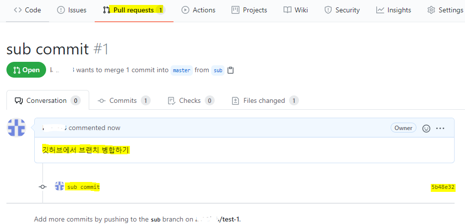 < > Code를 클릭하면 master 브랜치에도 sub.txt 파일이 보일 것입니다. sub에서 Merge pull request 됐다는 내용도 보입니다.