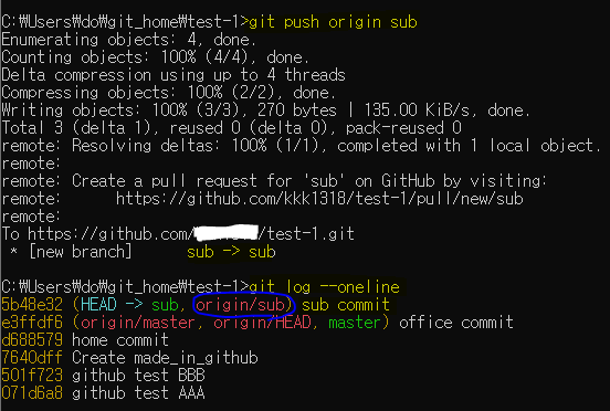 git_home\test-1 폴더에서 sub 브랜치를 만들고 원격저장소로 push 하겠습니다.