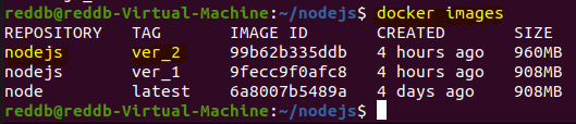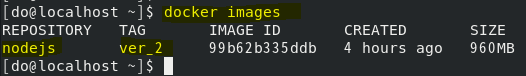 이제 도커 이미지 목록을 확인하면 nodejs:ver_2 이미지가 목록에 조회됩니다.