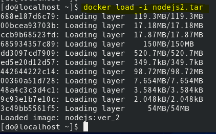이제 load 명령으로 nodejs2.tar 파일을 이미지로 로드하겠습니다.