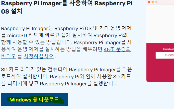 먼저 라즈베리파이 홈페이지에서 Windows용 Raspberry PI imager를 다운로드합니다.
