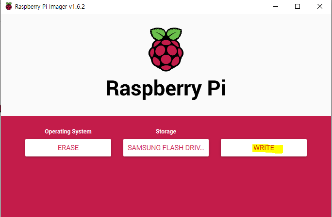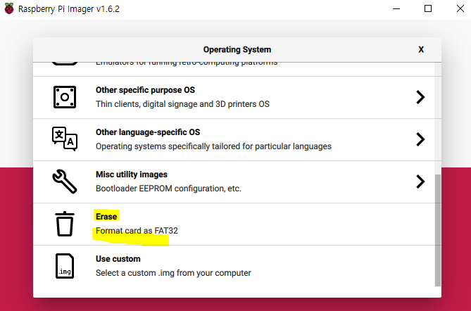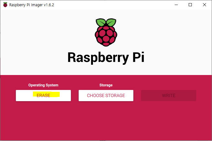 Imager가 설치 및 실행되면 먼저 OS 선택 클릭 후 Erase를 클릭합니다.