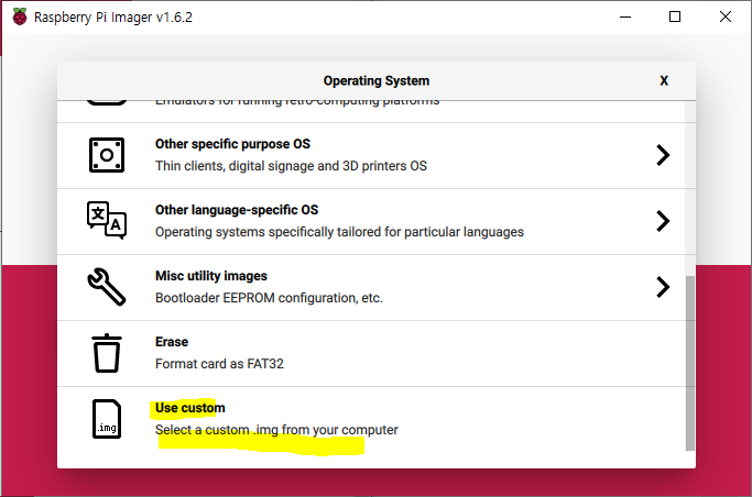포맷이 완료됐다면 다시 OS 선택 버튼을 클릭 후, 제일 아래에 Use costom을 선택합니다.