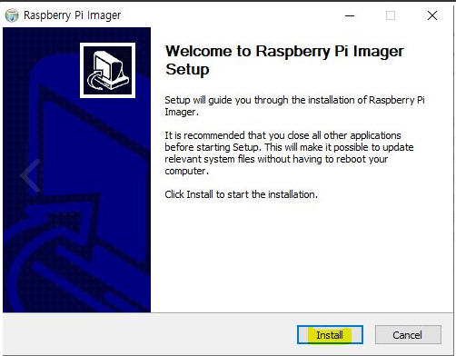 이제 다운로드한 라즈베리파이 Imager를 설치 및 실행해 줍니다.