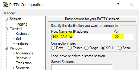 위에서 알아본 ip 주소는 192.168.0.14 였습니다. ssh 기본 포트는 22번 포트입니다.