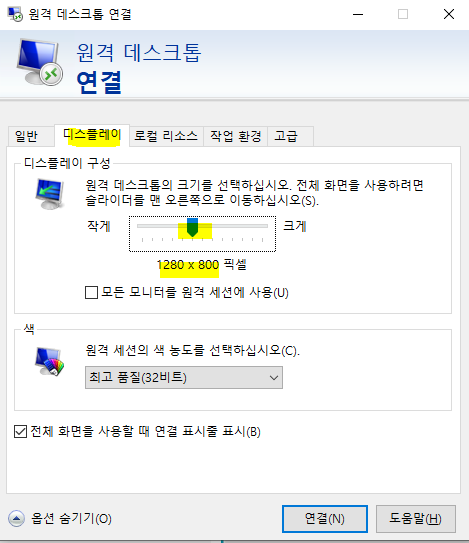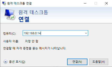 이제 재부팅 후 PC의 mstsc.exe(원격 데스크톱 연결)로 접속해 봅니다. (옵션에서 해상도 선택도 가능합니다.)
