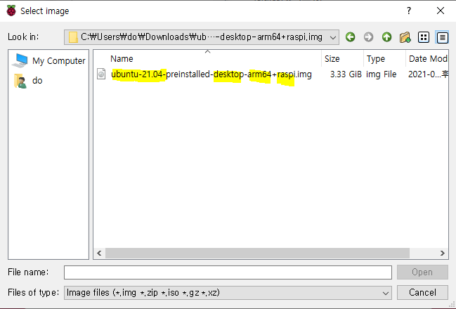 다운로드한 Ubuntu 파일을 압축을 풀고 img파일을 선택합니다.
