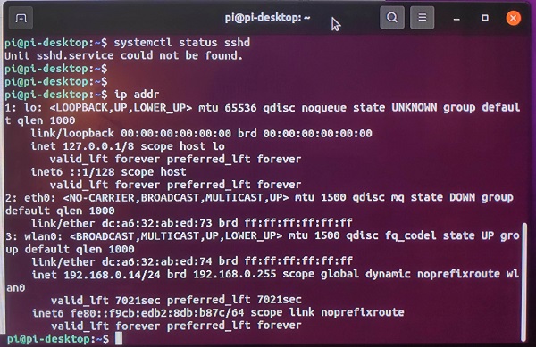 로그인을 하면 먼저 sshd가 실행 중인지 확인해 봅니다. ip addr로 라즈베리파이 ip 주소도 확인합니다.