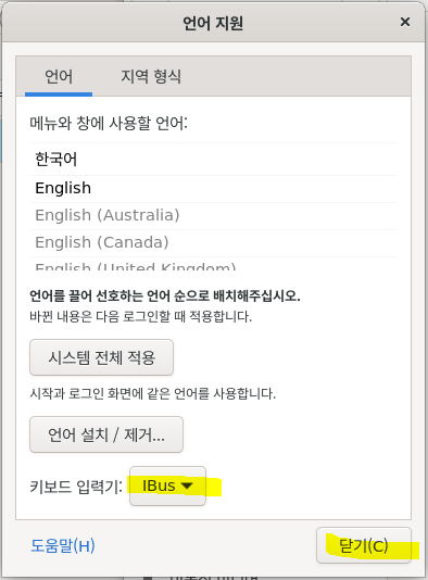 키보드 입력기를 IBus 선택하고 닫기를 클릭 한 후, 라즈베리파이를 재부팅 해줍니다.