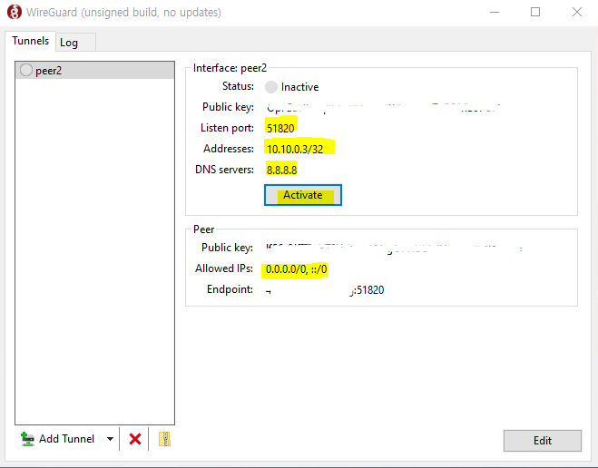 설치 및 실행 후 Add Tunnel을 클릭합니다. 라즈베리파이 peer 폴더에 있는 .config 파일을 해당 PC에 다운로드한 후 그 .config 파일을 선택합니다.